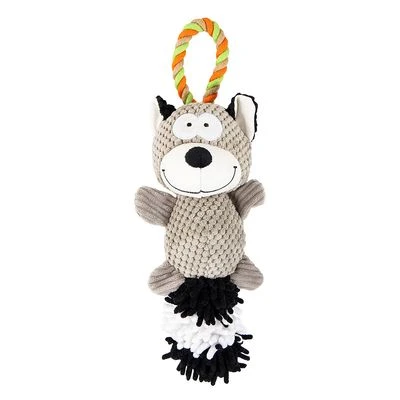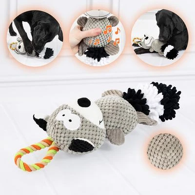 Cute plush raccoon for medium and large breed dogs, friendly design, with firm rope for tugging, also ideal for throwing, chewing and retrieving, with stimulating squeaker, made of polyester.