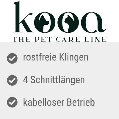 The kooa GEAR Mini battery clipper is equipped with a stainless steel clipper head and comes with a spacer comb attachment. The cutting length can be adjusted from 3 to 6 mm. The trimmer also allows detailed work on the ears and paws. The cordless operation ensures maximum flexibility during clipping. Alternatively, you can connect the device to the mains power supply via cable, whereby the batteries are charged automatically. This means the pet clipper is always ready for use.