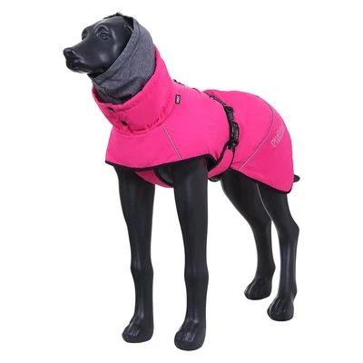 Dog coat in eye-catching pink that is water and wind repellent. With a warm fleece lining and soft padding and adjustable collar and waist area.