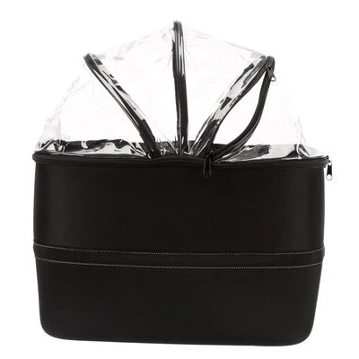This dog bicycle basket is designed to be fitted to the handlebars. The metal frame is attached to the front of the bicycle then the basket is mounted onto the frame and secured with clips and Velcro. It can be easily removed and lends itself to being used as a regular carry case thanks to the shoulder strap. This bicycle basket is fitted with a net covering and a rain hood which protects your dog from bad weather and any other external conditions.Â