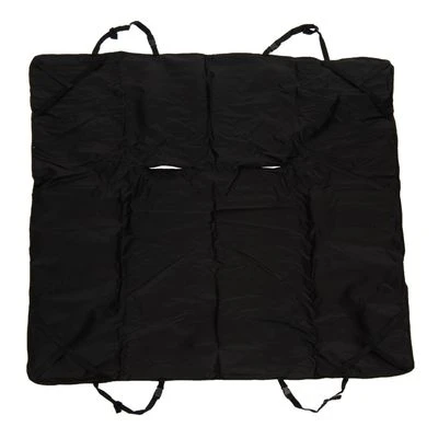 Protective cover for the back seat of a car, helping to keep dog hair and dirt off the upholstery, with a waterproof underside and soft fleece on top, fastening with straps and with a paw design.