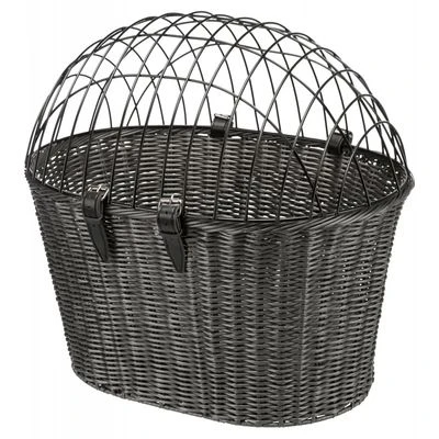 Practical front-mounted bicycle basket made from poly ratten, for small dogs, attaches to the handlebars, plastic-coated wire mesh cover, cushion included, colour: grey, maximum weight capacity: 5kg