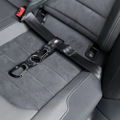 Robust strap for fastening your dog into the car, with a range of attachment options, with a metal ring and carabiner that can fasten to the car seatbelt and keep your dog safe.